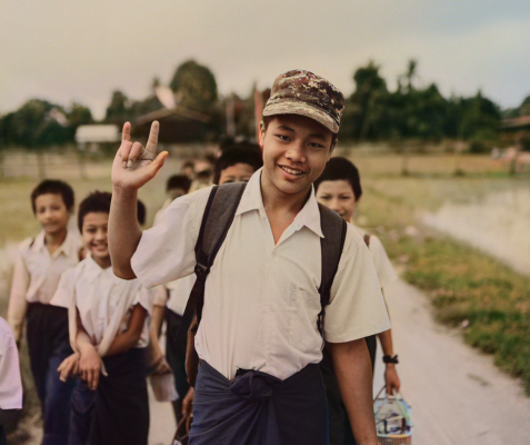 They walk in a single line through the neighborhood, along clean roads and narrow alleys shaded by bougainvillea and tall trees. The older children watch over the younger ones as they go. The line stays together until they reach the school gate, where teachers welcome them for the day.